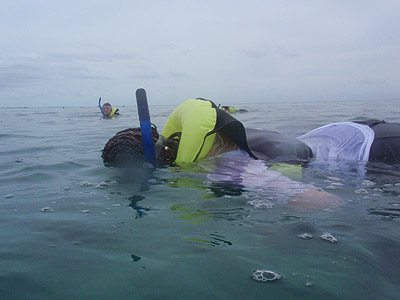 Osazenstvo naší lodě bylo rozděleno do čtyř skupin, načež jsme naskákali do vody a v této pozici jsme více než hodinu brázdili hladinu a mnozí také dno korálového útesu.